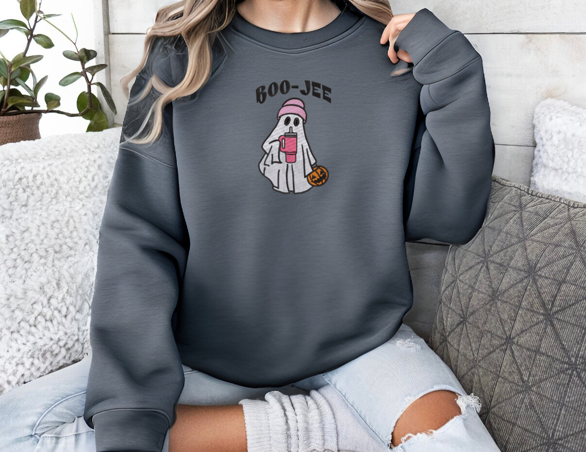 Embroidered ghost with tumblr and beanie. Please select color of tumblr and hat from the thread list.Â