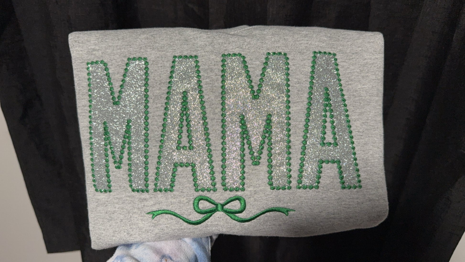 MAMA dotted WITH glitter. Name(s) with bow on sleeve.