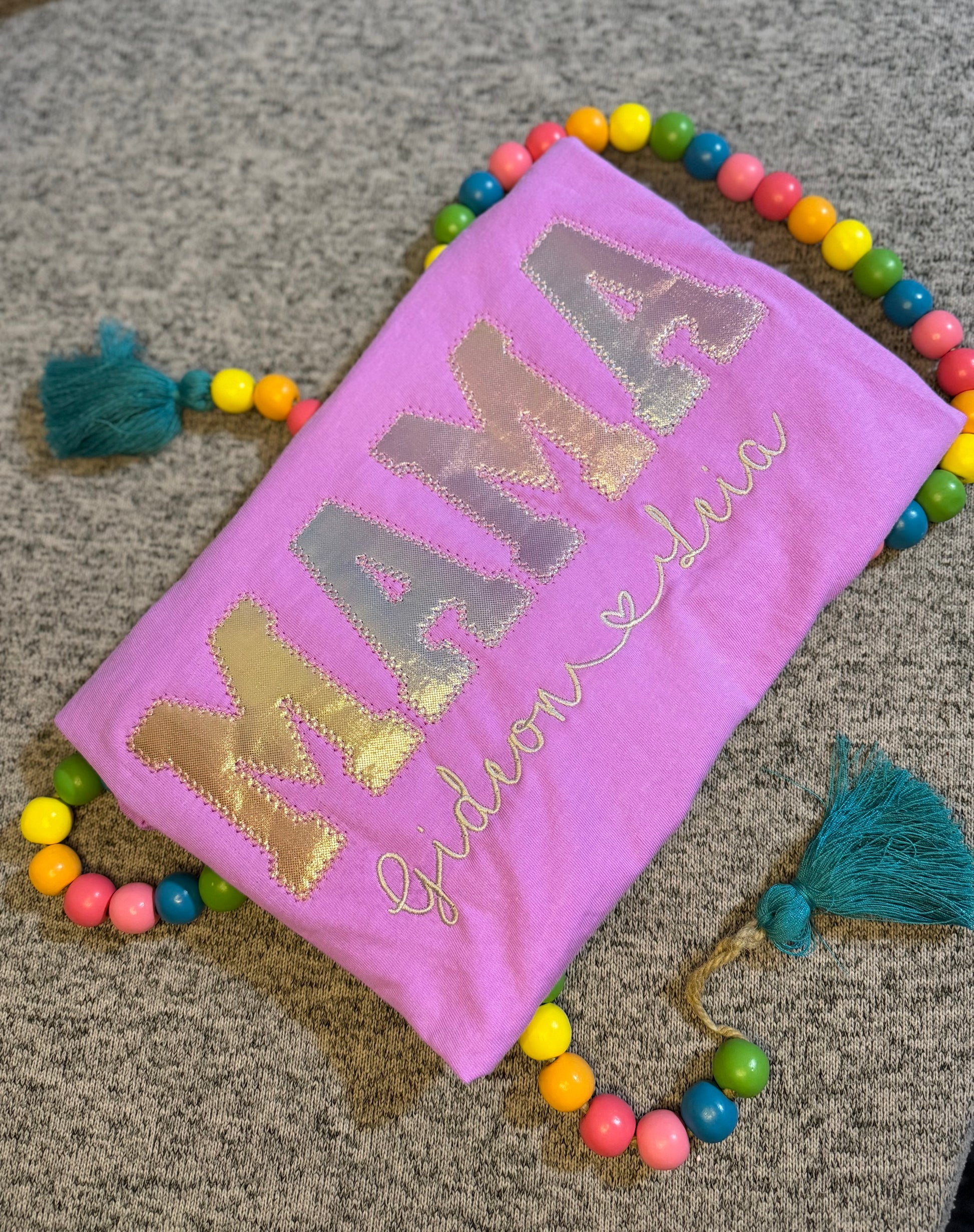 Rainbow ombré MAMA t-shirt. Please add name(s) in the personalization area.