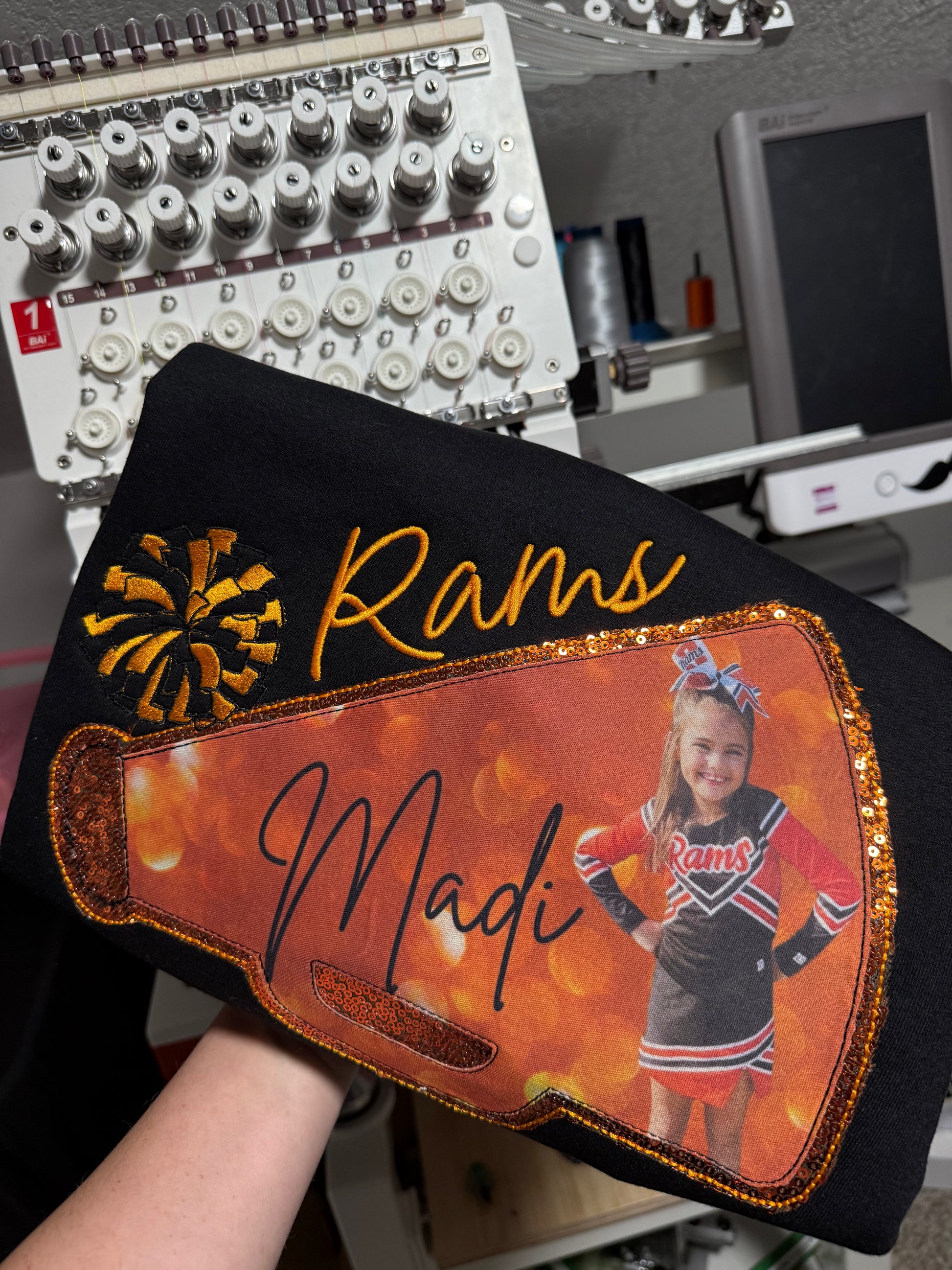 Custom photo added into cheerleading megaphone. Please type in the thread color wanted for the Pom and Team. Use the personalization for the team and/or custom name. The longer the name the smaller the font. Please use a clear photo. Backgrounds can be removed or left.