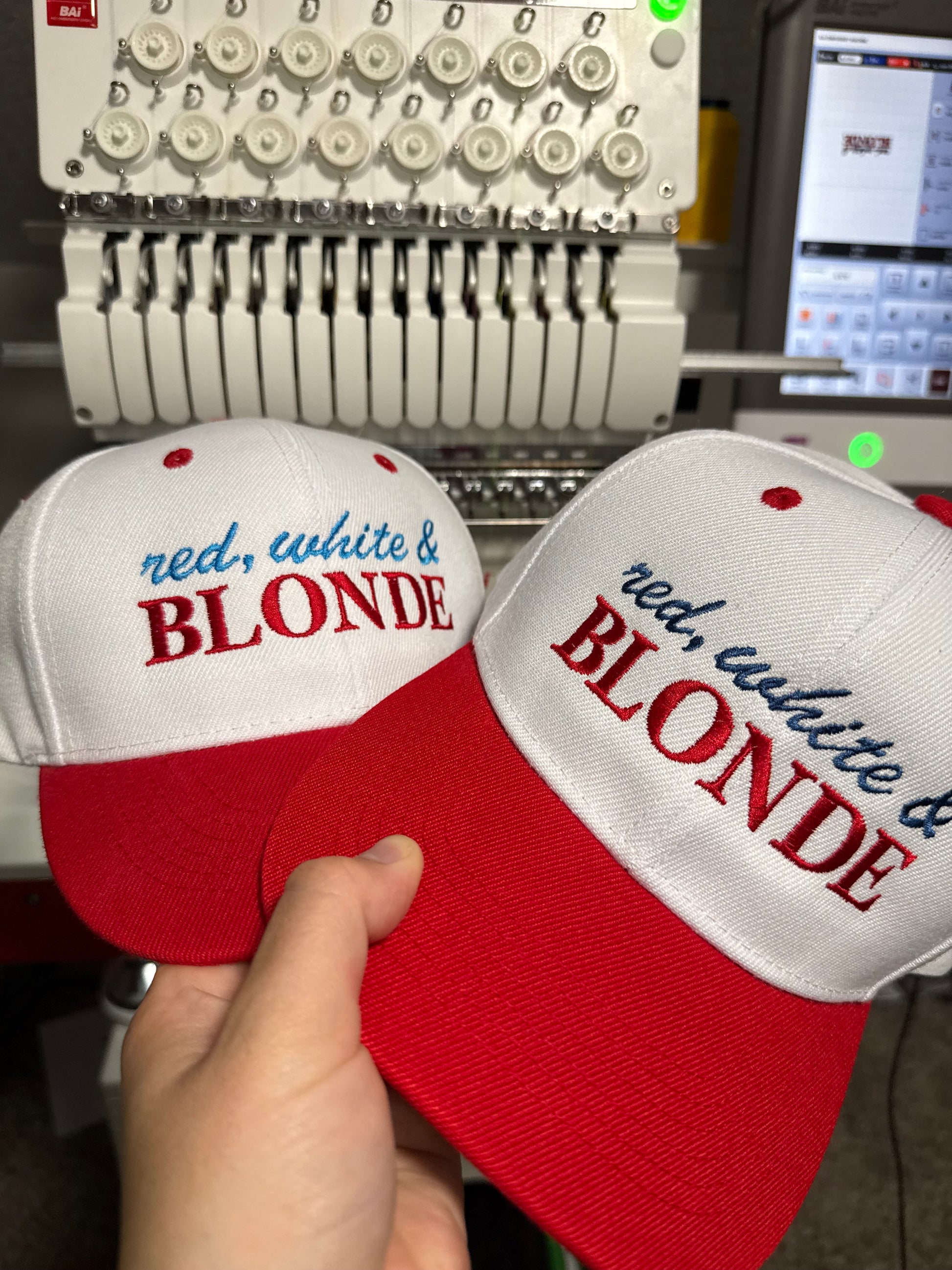 Choose what you would like the hat to say in the personalization area. Red white and Brunette, blonde, feral, Santa, etc. You name it and I can add it. Size depends on the word length.